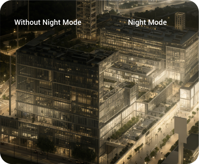 Gece Modu, düşük ışıklı ortamlarda pozlamayı otomatik olarak ayarlar ve sabah erken saatlerde, akşamları veya loş sahnelerde görünürlüğü artırır.