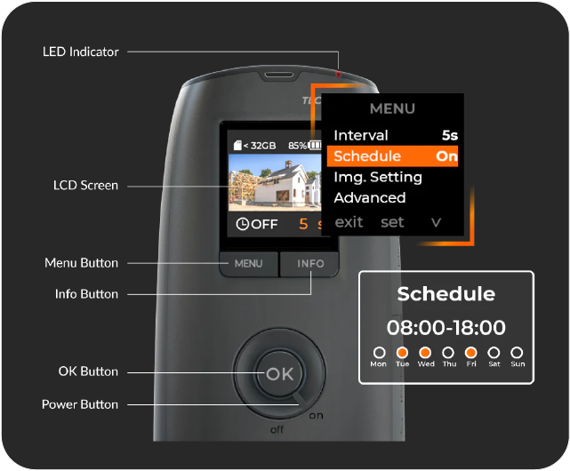 Brinno zaman atlamalı kameralar, kayıt sürelerini optimize etmek, pil tasarrufu yapmak ve depolama alanını verimli bir şekilde yönetmek için akıllı planlama sunar. Günlük ve haftalık planlama sayesinde kullanıcılar, kaydı belirli saat veya günlerle sınırlayabilir; bu da sürekli izleme gerektirmeyen projeler için idealdir.
